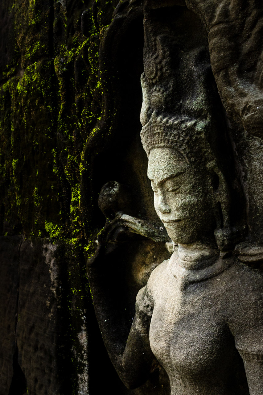 Angkor Wat is ladened with fine examples of devata. Head to the central tower for some of the finer and goddesses. For visitors, see if you can fine the two devata showing their teeth, said to be forbidden! (clue: one is near the Vishnu statue at the west entry gate, there is another on the second level of Angkor). The statues at the rear of Angkor are a favourite for Darren, a bit weathered with exquisite Apsara styled hair. Beyond Angkor, the remote over grown temples are great hunting grounds. Check for hidden gems in places like Ta Prohm, Preah Kkan, Ta Som and Banteay Kdei. Here you’ll find more rustic and weathered devata which makes them quite photogenic, especially during the wetter months. Last but not lease, an early morning visit to Banteay Srei (don’t forget your long lens, the main temple is roped off) with it’s pink sandstone carvings offering some of the finest carvings. Don’t limit yourself to these suggestions, there are many areas worth exploring. Enjoy your time, best early or late searching for that magical light.